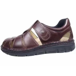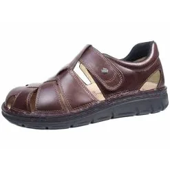 Sportive Herren Sandalen von Finn Comfort aus angenehm weichem und hochertigem Leder. Innen ist der Schuh mit einem cromfrei gegerbtem Leder ausgestattet. Der Schuh hat eine normale Weite. Der Absatz ist durchgehend flach. Die weiche PU-Sohle schont die Gelenke und federt jeden Ihrer Tritte optimal ab. Der Klettverschluss zum einfachen und bequemen an- und ausziehen sorgt für einen guten Halt.Ebenfalls ist eine stufenlose Anpassung an den Fuß möglich. Die Schuhgröße fällt regulär aus.