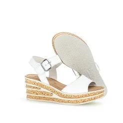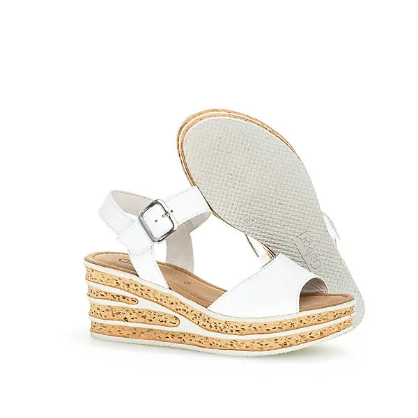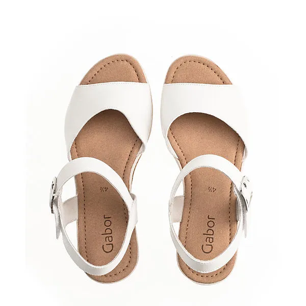 Super schicke Damen Sandalette in vielen Farben von Gabor mit einem anschmiegsames Obermaterial aus Leder. Der hoohe Keilabsatz in einer schicken Kork-Optik gehalten – den nötigen halt am Fuß gibt das Fesselriemchen mit Schnalle – für mehr Bequemlichkeit sorgt die weiche Gabor-Sohle.