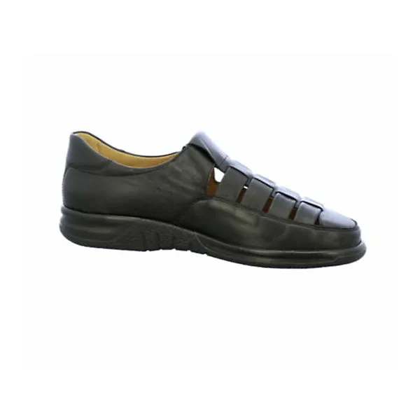 Sportive Herren Sandalen von Ganter aus einem feinen hochwertigem Glattleder. Innen ist der Schuh mit einem cromfrei gegerbtem Leder ausgestattet. Der Schuh verfügt über eine etwas breitere Weite. Der Absatz ist durchgehend flach. Die Laufsohle ist aus Gummi. Der Klettverschluss zum einfachen und bequemen an- und ausziehen sorgt für einen guten Halt.Ebenfalls ist eine stufenlose Anpassung an den Fuß möglich. Die Schuhgröße fällt regulär aus.