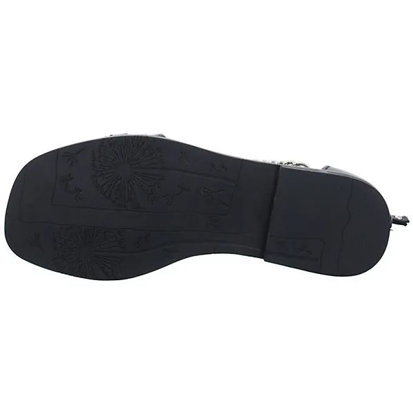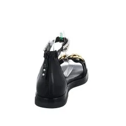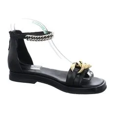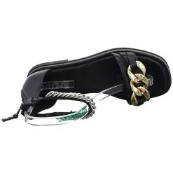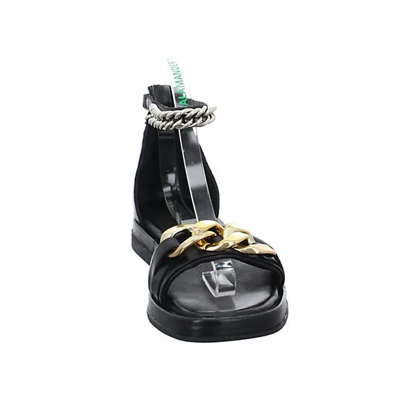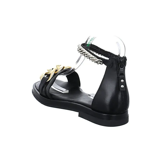Diese modische Sandale ist aus einem hochwertigem Leder gefertigt. Ganz in Schwarz mit Zierketten in Gold und Silber runden sie jedes Sommeroutfit perfekt ab. Ein trendiges Must-Have für jede Fashionista das in keinem Schuhschrank fehlen darf.