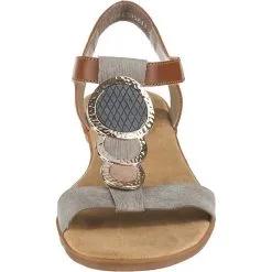 – moderne Sandale fĂĽr die modebewusste Frau von der Marke Rieker – hoher Tragekomfort durch das ergonomisch geformte FuĂźbett – praktischer Klettverschluss zum einfachen SchlieĂźen – ein Hingucker sind die groĂźen Schmuckapllikationen auf dem Obermaterial