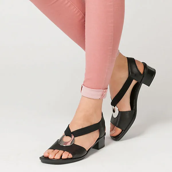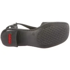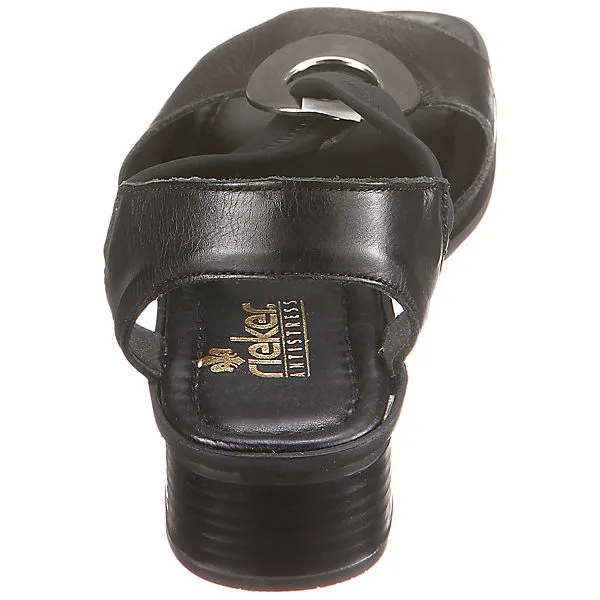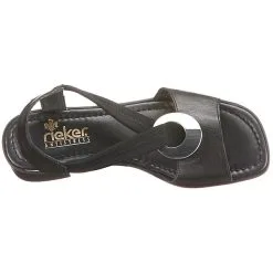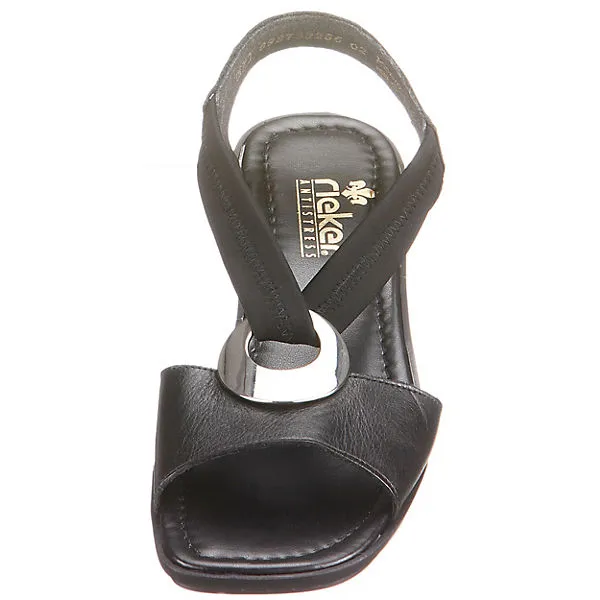 Mögen Sie es schlicht und klassisch zugleich, dann liegen Sie mit dieser Sandale von RIEKER aus edlem schwarzem Glattleder genau richtig. Sie ist für heiße Sommertage besonders geeignet, denn das Design ist sehr puristisch und setzt auf diese Weise Ihre gebräunten Füße reizvoll in Szene. Auffallendes Detail ist der silberfarbene Ring auf dem breiten Zehenriemen, durch den ein breites Elastikband über den Spann gezogen allzeit für festen Sitz sorgt und in Verlängerung des Fersenriemens agiert. Die weiche Synthetiksohle, die mit dem RIEKER eigenen Antistress-System ausgestattet ist, entlastet beim Gehen und Stehen Ihre Füße und macht diese Sandale zu einem attraktiven erholsamen Begleiter im Alltag.