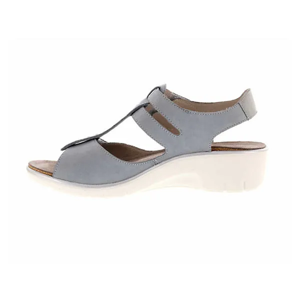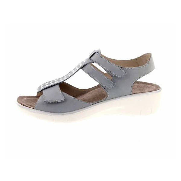 Schöne Sandalen von Solidus aus einem feinen hochwertigem Veloursleder. Innen ist der Schuh mit einem cromfrei gegerbtem Leder ausgestattet. Der Schuh verfügt über eine etwas breitere Weite. Der Keilabsatz hat eine Höhe von cirka 3 cm. Die Laufsohle ist aus Gummi. Der Klettverschluss zum einfachen und bequemen an- und ausziehen sorgt für einen guten Halt.Ebenfalls ist eine stufenlose Anpassung an den Fuß möglich. Die Schuhgröße fällt regulär aus.