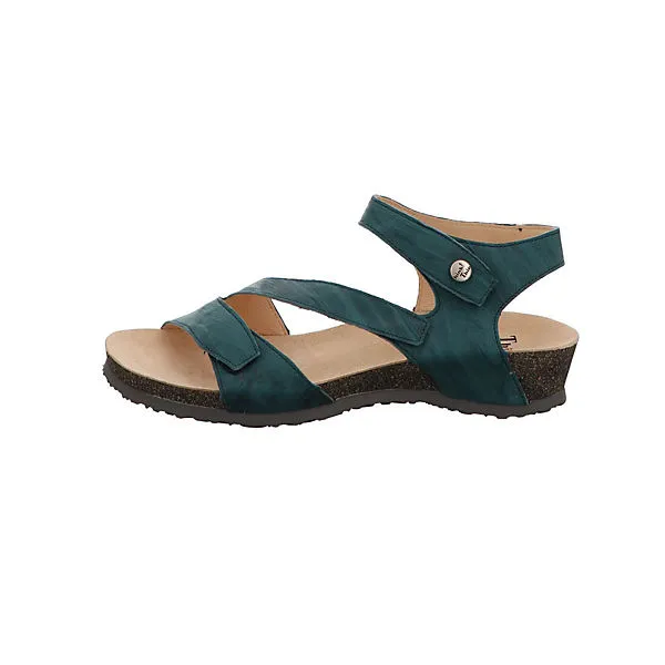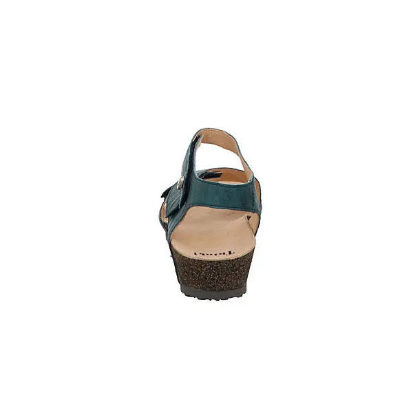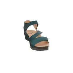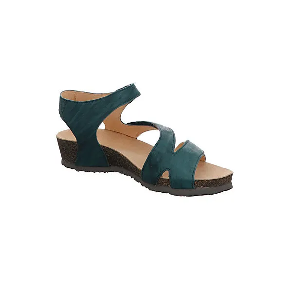 Schöne Sandalen von Think aus einem feinen hochwertigem Veloursleder. Innen ist der Schuh mit einem cromfrei gegerbtem Leder ausgestattet. Der Schuh hat eine normale Weite. Der Absatz ist durchgehend flach. Die Laufsohle ist aus EVA-Material. Der Klettverschluss zum einfachen und bequemen an- und ausziehen sorgt fĂŒr einen guten Halt.Ebenfalls ist eine stufenlose Anpassung an den FuĂ möglich. Die SchuhgröĂe fĂ€llt regulĂ€r aus.